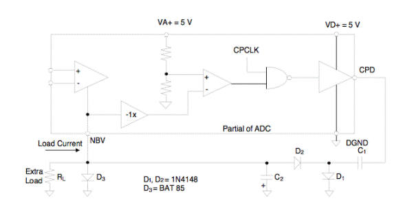 圖4給出了本應(yīng)用筆記中列出的A / D轉(zhuǎn)換器內(nèi)部的基本電荷泵調(diào)節(jié)環(huán)路的簡化版本。電荷泵驅(qū)動引腳(CPD)由XIN頻率產(chǎn)生的時鐘(CPCLK)驅(qū)動,可直接使用。CS5521 / 22/23/24/28器件使用XIN / 2 /時鐘。穩(wěn)壓器環(huán)路將電荷存儲電容器上產(chǎn)生的電壓幅度與VA +電源幅度的一部分進(jìn)行比較。該環(huán)路旨在將NBV的電壓調(diào)節(jié)為– [VA + / 2.38]V。請注意,如果芯片的VA +電源電壓高于+5 V,則NBV上的電荷泵輸出的電壓為成比例的更負(fù)面。當(dāng)NBV引腳上的電壓達(dá)到適當(dāng)?shù)姆葧r,電荷泵時鐘的周期將被刪除。調(diào)節(jié)環(huán)路將來自CPD引腳的脈沖頻率保持在產(chǎn)生適當(dāng)輸出電壓的平均頻率。CPD驅(qū)動器輸出由VD +電源提供,如圖4所示?梢詾+5 V或+3V。圖4所示的二極管電荷泵用于+5 V電源。肖特基二極管D3確保NBV引腳的接地降落不超過二極管的壓降。這樣可以確保調(diào)節(jié)器環(huán)路正確啟動。