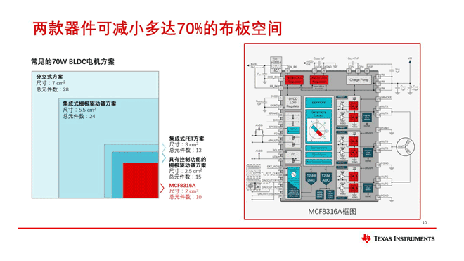 本次推出兩款新產(chǎn)品,分別是MCF8316A和MCT8316A。前者采用磁場定向控制技術(shù),后者梯形控制技術(shù),無需傳感器,通過這兩款產(chǎn)品,可以把整個(gè)電機(jī)方案的尺寸減少70%。