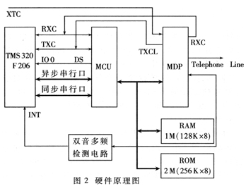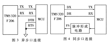調(diào)制解調(diào)器采用異步連接同步傳輸?shù)墓ぷ鞣绞,即在異步方式下進行連接,建立連接后進入同步傳輸狀態(tài)。由于TMS320F206及MCU都為TTL電平,故它們之間可直接相連。異步串行口及同步串行口具體連線見圖3和圖4。