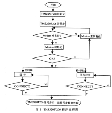 系統(tǒng)工作流程如下:系統(tǒng)上電復(fù)位后,TMS320F206首先進行初始化,打開異步口,然后檢測調(diào)制解調(diào)器是否準備好。若沒準備好,則對調(diào)制解調(diào)器再次復(fù)位;若準備好,則送AT命令進入調(diào)制解調(diào)器?對調(diào)制解調(diào)器進行初始化。即使能調(diào)制解調(diào)器同步口,將調(diào)制解調(diào)器設(shè)置為異步連接同步傳輸方式,采用外部時鐘以及對同步傳輸模式、傳輸速率等相關(guān)特性進行設(shè)置。同時決定主叫端是否加上ATX1命令以及被叫端是采用何種應(yīng)答方式。調(diào)制解調(diào)器每次收到正確AT命令且正確進行相應(yīng)操作后,會通過異步串口回送OK信號。因此,若TMS320F206收到OK信號,就表明初始化成功。調(diào)制解調(diào)器初始化完成后,主叫端便撥號啟動呼叫,被叫端進入自動應(yīng)答或偽自動應(yīng)答過程。連通后,調(diào)制解調(diào)器會回送CONNECT信息給TMS320F206。此后TMS320F206便禁止異步口、打開同步口,開始進行同步數(shù)據(jù)傳輸。