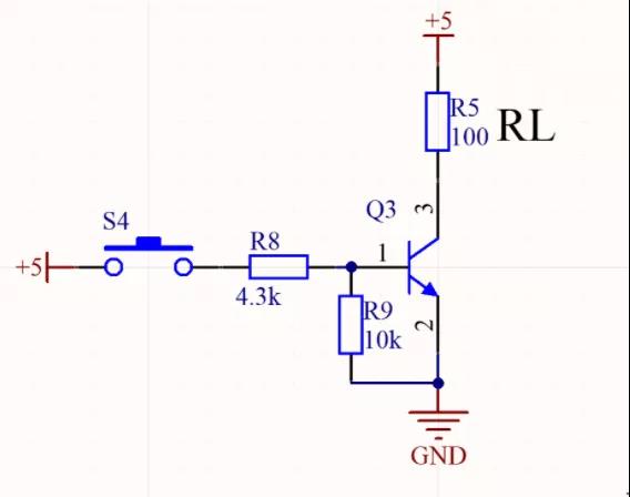 如下圖為PNP型三極管,按下開關S2,約1mA的Ib流過箭頭,三極管工作在飽和狀態(tài),e極到c極完全導通,c極電平接近5V,負載RL兩端壓降接近5V。