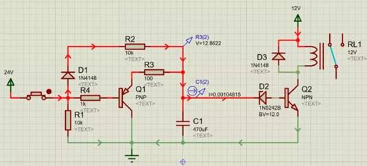 為三極管延時導通,快速關斷的一個仿真電路,D1、R2、C1、D2構成延時導通Q2的回路,C1的電壓為12V的時候Q2導通,R3、Q1、R4、R1構成快速關斷Q2的回路,C1通過R3和Q1快速放電。