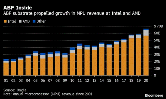 隨著互聯(lián)網(wǎng)的繁榮,ABF載板的銷量在21世紀初飆升,但從21世紀頭十年的后期開始,隨著智能手機開始逐漸取代PC,電腦出貨量不斷下降,ABF載板的銷量受到了沖擊。由于ABF材料更多適用于電腦使用的CPU,在早期智能手機之中幾乎沒有用武之地,價格也相對其他材料更為昂貴,因此在移動端不占有任何優(yōu)勢。