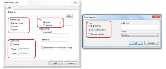 option來完成。除了訪問之外,還可以監(jiān)測(cè)數(shù)據(jù)是否匹配。這意味著只有當(dāng)數(shù)據(jù)匹配時(shí),寫或讀的訪問才會(huì)觸發(fā)停止。選擇“Edit”按鈕,可以打開一個(gè)額外的窗口,可以選擇絕對(duì)地址甚至是源代碼行。如果是一個(gè)變量或標(biāo)志,建議使用自動(dòng)大小。如果需要監(jiān)測(cè)更大的范圍,應(yīng)手動(dòng)設(shè)置所需的大小。