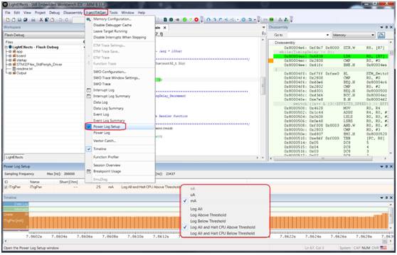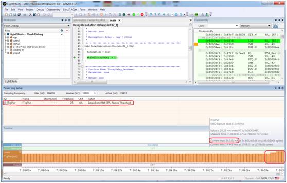 Workbench的功率調(diào)試技術(shù),開發(fā)人員可以監(jiān)控能耗并將其與源代碼聯(lián)系起來。這使得了解整個(gè)應(yīng)用的能耗成為可能。這個(gè)概念也使得添加功率斷點(diǎn)成為可能?梢栽O(shè)置一個(gè)閾值,比如25mA,一旦能耗超過這個(gè)值,調(diào)試器就會(huì)中斷。