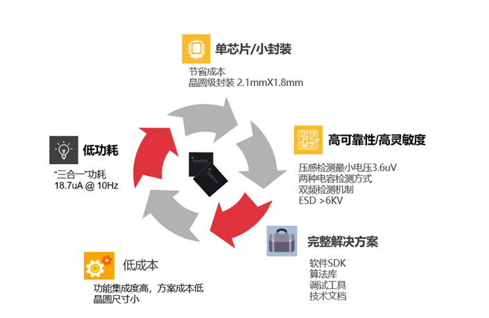 TCAE系列芯片集成了32位ARM® Cortex®-M0高性能內(nèi)核,最高工作頻率32MHz,內(nèi)置64KB FLASH和4KB SRAM。其內(nèi)部集成了高精度ADC、1024倍增益放大的超低噪聲PGA,可實現(xiàn)高達21.5位的信號鏈有效精度,并配備了Offset自動消除硬件電路,可實現(xiàn)uV級小信號在各種環(huán)境干擾和溫度漂移下的精準測量。泰矽微還開發(fā)了獨創(chuàng)的降低系統(tǒng)整體功耗的Tinywork®技術(shù)(專利號:CN111427443A),使得外設(shè)在睡眠模式下,無需內(nèi)核處理器的干預也能獨立工作和相互協(xié)同,可將典型應用場景的工作電流降低80%以上。外加超低功耗的睡眠模式設(shè)計,在TWS耳機人機交互應用場景中,將壓力檢測,滑條及入耳檢測三種功能融合下的典型應用功耗控制在18uA左右,引領(lǐng)行業(yè)標桿水準。TCAE系列MCU具有高可靠性的典型特征,高達6kV的ESD設(shè)計免除了外部器件防護的需求,有利于非常局限的狹小空間中的硬件設(shè)計。