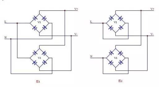 在小功率設(shè)計(jì)中,一般很少用到整流橋的并聯(lián),但在某些大功率輸出的情況下,不想增添新的器件單個(gè)整流橋電流又不滿足輸入功率要求,就需要用到整流橋的并聯(lián)了,整流橋的并聯(lián)不能采用兩個(gè)整流橋各自整流后直流并聯(lián)的方式,也就是不能采用圖1的方式,因?yàn)檎鳂驔]有配對(duì),單純靠自身的V-I特性,一般是無法均流的,這樣就會(huì)造成兩個(gè)整流橋發(fā)熱不一致。而采用圖2的方式,通常認(rèn)為在一個(gè)封裝內(nèi)的兩個(gè)二極管是非常匹配的,是可以均分電流的,所以采用圖2的方式就可以實(shí)現(xiàn)整流橋的并聯(lián)了。