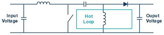 開關(guān)模式穩(wěn)壓器也具備關(guān)鍵的熱回路,這對于實現(xiàn)低電磁干擾行為是必不可少的。如果這些熱回路設(shè)計巧妙,寄生電感很低,那么只會產(chǎn)生很小的電壓偏移,從而減少輻射干擾。在