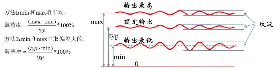 注意區(qū)分調(diào)整率和紋波,紋波是輸出的動態(tài)特征,而調(diào)整率是讓電源工作在極限外部條件下,輸出的極限偏差。