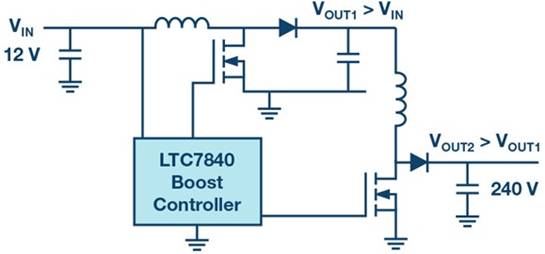 如果應(yīng)用中需要更高的升壓因數(shù),那么兩級(jí)式概念也是一種選擇。ADI的新型LTC7840在單芯片中包含兩個(gè)升壓控制器,可輕松實(shí)現(xiàn)兩級(jí)式升壓概念。圖3顯示了一個(gè)從12V電源電壓升壓至240V輸出電壓的例子。兩個(gè)升壓級(jí)可分步提升電壓,使每yi級(jí)僅需將電壓提升4.5倍左右。