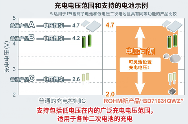 在這種背景下,ROHM開發(fā)出一款充電控制IC,不僅支持鋰離子二次電池的充電,還支持全固態(tài)和半固態(tài)等新型二次電池的低電壓充電。