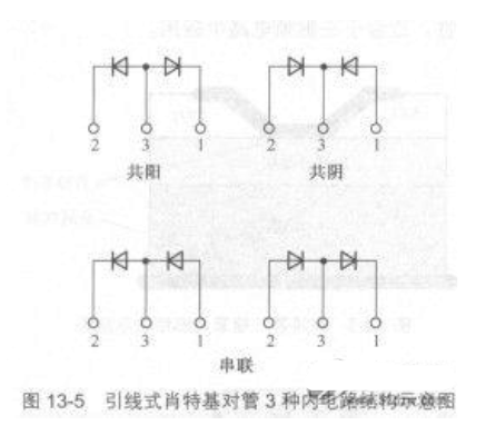 引線式肖特基對(duì)管又有共陽(兩管的正極相連)、共陰(兩管的負(fù)極相連)和串聯(lián)(一只二極管的正極接另一只二極管的負(fù)極)3種引腳引出方式。JRC2352圖13-5是引線式肖特基對(duì)管內(nèi)電路結(jié)構(gòu)示意圖。
