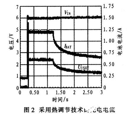 如何改進(jìn)設(shè)計(jì)才能確保充電器在安全散熱范圍內(nèi)正常工作呢?更高級(jí)的電池充電器(如bq2406x與bq2403x)引入了熱調(diào)節(jié)環(huán)路,可避免充電器過(guò)熱。內(nèi)部芯片溫度達(dá)到預(yù)定義的溫度閾值后(如110℃),器件溫度只要進(jìn)一步提升就會(huì)使充電電流下降。這有助于限制功耗,并為充電器提供熱保護(hù)。使IC結(jié)溫升高到熱調(diào)節(jié)的最大功耗取決于PCB板布局、散熱通孔的數(shù)量以及環(huán)境溫度。從圖2看出,1.2 s之后,熱環(huán)路會(huì)在2 s內(nèi)將有效充電電流從1.2 A降至600 mA。
