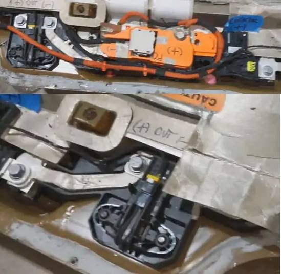 接觸器的組合:主正、主負(fù)和兩個雙胞胎的快充接觸器,放在了電池系統(tǒng)的后部,設(shè)計(jì)了維修窗口,從座椅下方進(jìn)行處理。