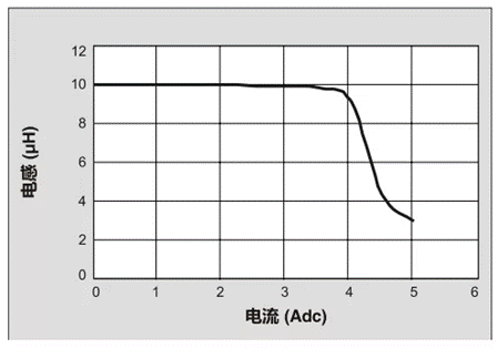 電流通過(guò)電感的一個(gè)影響是鐵芯飽和。DC-DC轉(zhuǎn)換器的電流波形一般都有一個(gè)直流成分。此直流電流通過(guò)電感時(shí)偏置鐵芯從而導(dǎo)致其磁通量飽和。設(shè)計(jì)人員需要知道,當(dāng)發(fā)生飽和時(shí),電感值下降,元件功能也不再表現(xiàn)為電感。圖1是一個(gè)帶氣隙的鐵氧體磁芯的電感值與電流的曲線圖。可以看到,當(dāng)電感進(jìn)入飽和區(qū)域時(shí),這條曲線有一個(gè)“拐點(diǎn)”。因此,對(duì)飽和電流的定義就顯得有些隨意,但必須對(duì)其進(jìn)行定義。在圖2的例子中,飽和電流被定義為電感值下降10%時(shí)的電流。在10-20%的范圍內(nèi)進(jìn)行定義是很普遍的,但應(yīng)注意的是,有些電感目錄可能會(huì)定義為電感值下降50%時(shí)的電流。這會(huì)增大電流額定值,但就電流的可用范圍而言,這可能會(huì)引起誤導(dǎo)。