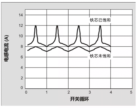 圖2:鐵芯飽和及不飽和時(shí)的電感電流波形