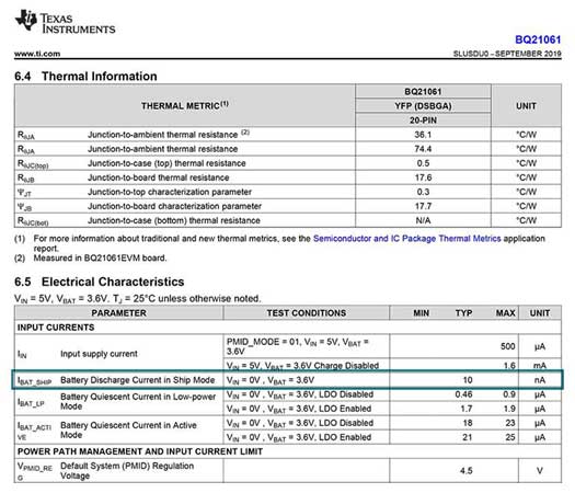 部分IC具有多種關(guān)斷狀態(tài),比如 TI的BQ25120電池充電器的2nA運(yùn)輸模式,或者 TPS61094 升壓轉(zhuǎn)換器的4nA旁路模式。在這些高級(jí)關(guān)斷狀態(tài)下,為了僅消耗極少量的靜態(tài)電流,通常會(huì)啟用非常有限的器件功能。與靜態(tài)電流為700nA的 BQ25120 高阻抗(關(guān)斷)模式和靜態(tài)電流為200nA 的TPS61094 關(guān)斷模式相比,運(yùn)輸節(jié)電模式和旁路模式可將電池運(yùn)行時(shí)間分別延長 350 倍和 50 倍。