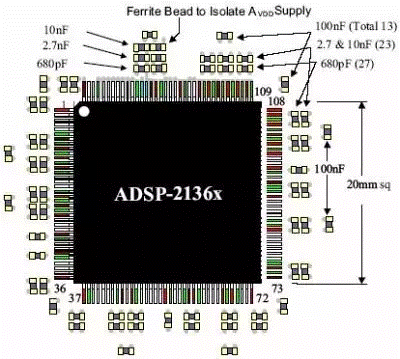 還有一點(diǎn)要注意,在放置時(shí),最好均勻分布在芯片的四周,對(duì)每一個(gè)容值等級(jí)都要這樣。通常芯片在設(shè)計(jì)的時(shí)候就考慮到了電源和地引腳的排列位置,一般都是均勻分布在芯片的四個(gè)邊上的。因此,電壓擾動(dòng)在芯片的四周都存在,去耦也必須對(duì)整個(gè)芯片所在區(qū)域均勻去耦。如果把上圖中的680pF電容都放在芯片的上部,由于存在去耦半徑問(wèn)題,那么就不能對(duì)芯片下部的電壓擾動(dòng)很好的去耦。