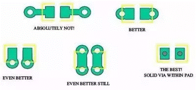 第二種方法在焊盤的兩個(gè)端點(diǎn)緊鄰焊盤打孔,比第一種方法路面積小得多,寄生電感也較小,可以接受。