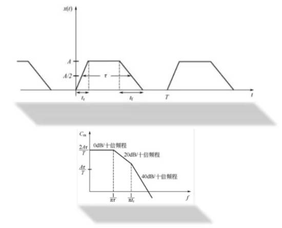 下圖為梯形脈沖波形的時(shí)域波形和頻譜包絡(luò)線;A=幅度,tr=上升沿時(shí)間,τ=平均寬度。從圖中可以看出上升時(shí)間對于高頻諧波存在的影響。可見在EMC設(shè)計(jì)中,著重關(guān)注快速上升沿信號是有充分的理由的,而且?guī)缀跛嘘P(guān)于干擾發(fā)射的測試中,快速上升沿信號,都是最主要因素。那是否只需要處理這類信號就行了呢。由于EMC測試中還有抗擾度項(xiàng)目,所以對慢速信號的處理也需要處理。
