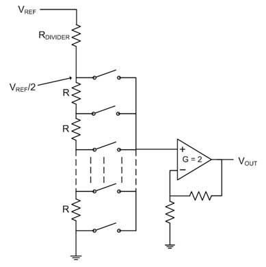 電阻串 DAC 設(shè)計最終、最微妙的元件是位于串電阻器及接點之前的分壓器。該電阻器電阻等于串中其余電阻器的等效阻抗,能有效將參考輸入減半。這樣做的目的是降低輸出緩沖器的共模輸入要求,并在實現(xiàn)良好性能的同時幫助保持低成本。為了對此進行補償,輸出緩沖器一般采取 2 倍的非反相增益,盡管有時反饋電阻器通過數(shù)字控制實現(xiàn)不同增益。