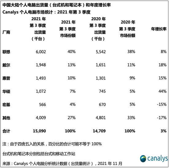 2021年第3季度臺(tái)式機(jī)和筆記本市場(chǎng)的前四名供應(yīng)商均實(shí)現(xiàn)了同比增長(zhǎng),反映了全球科技經(jīng)濟(jì)體蓬勃的發(fā)展勢(shì)頭以及對(duì)中國(guó)市場(chǎng)帶來(lái)的積極影響。“本季度臺(tái)式機(jī)和筆記本總體比上年增長(zhǎng)了3%,相較與兩年前增長(zhǎng)則高達(dá)12%,這是因?yàn)樯逃妙I(lǐng)域出現(xiàn)了新一輪的升級(jí)潮,另外,政府提倡的‘工業(yè)4.0’計(jì)劃,使得制造業(yè)也逐漸釋放出新的活力。除此之外,教育部門也在持續(xù)進(jìn)行軟硬件設(shè)施的升級(jí),建設(shè)并更新數(shù)字化教室和現(xiàn)代化實(shí)驗(yàn)室,這為市場(chǎng)注入了強(qiáng)大的動(dòng)力。在商業(yè)領(lǐng)域增長(zhǎng)的同時(shí),學(xué)生新學(xué)期的采購(gòu),以及商家為即將到來(lái)的“雙十一“的備貨,使得消費(fèi)電腦的出貨量也出現(xiàn)了強(qiáng)勁需求,”CanalysPC分析師EmmaXu表示。