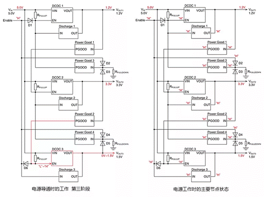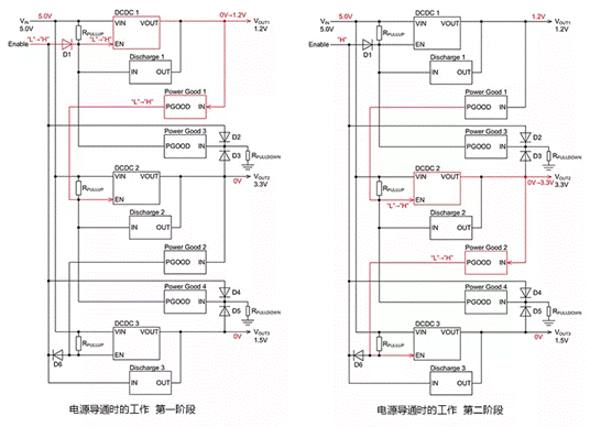 2) 由于DCDC 1的EN引腳通過(guò)二極管D1變?yōu)椤癏”,因此DCDC 1啟動(dòng)。