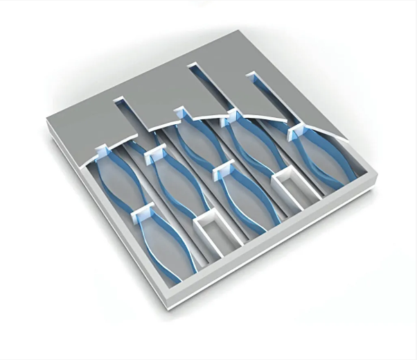 微型揚(yáng)聲器的內(nèi)部是一個(gè)微小的柔性光束陣列,每個(gè)光束的長(zhǎng)度只有20微米。當(dāng)音頻信號(hào)的電壓被施加到該設(shè)備上時(shí),它使這些光束反復(fù)向彼此彎曲。當(dāng)它們這樣做時(shí),它們迫使空氣從設(shè)備的頂部和底部的小開(kāi)口中流出。被抽出的空氣在耳朵里產(chǎn)生壓力波動(dòng),被感知為聲音。