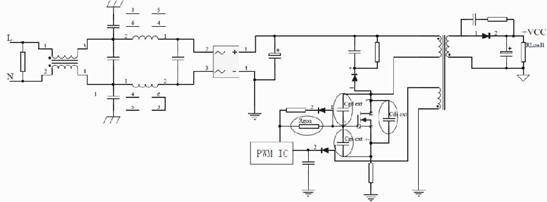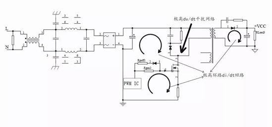 由1-1和1-2式可知,寄生電感和di/dt形成電壓尖峰,寄生電容和dv/dt形成電流尖峰。這些快速變化的電流和關(guān)聯(lián)的諧波在其他地方產(chǎn)生耦合的噪聲電壓,因此影響到開關(guān)電源EMI特性。下面以反激式開關(guān)拓?fù)錇槔瑢档蚆OSFET的dv/dt和di/dt措施進(jìn)行介紹。
