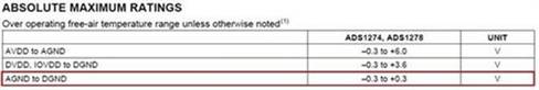 圖3:適用于ADS1278 AGND和DGND的絕對(duì)最大額定值