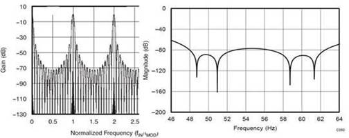 圖4:Sinc 3濾波器響應(yīng)在ADS1298中的輸出頻率達(dá)4 × fMOD(a),同時(shí)在ADS1220中的抑制頻率為50Hz和60Hz(b)