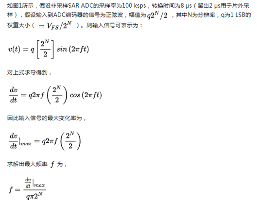 非采樣ADC的一個缺點(diǎn)是,如果在A-to-D的轉(zhuǎn)換期間內(nèi),輸入信號變化超過了1 LSB ,則輸出數(shù)字碼會出現(xiàn)較大的誤差,多數(shù)ADC或多或少都會遇到這樣的問題。下面通過一個簡單計算來說明非采樣ADC的輸入頻率限制。