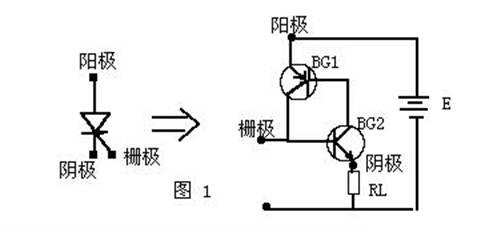 我們可以把從陰極向上數(shù)的、二、三層看面是一只NPN型號晶體管,而二、三、四層組成另一只PNP型晶體管。其中第二、第三層為兩管交迭共用。可畫出圖1的等效電路圖。當(dāng)在陽極和陰極之間加上一個正向電壓E,又在控制極G和陰極C之間(相當(dāng)BG2的基一射間)輸入一個正的觸發(fā)信號,BG2將產(chǎn)生基極電流Ib2,經(jīng)放大,BG2將有一個放大了β2 倍的集電極電流IC2 。因?yàn)锽G2集電極與BG1基極相連,IC2又是BG1 的基極電流Ib1 。BG1又把Ib1(Ib2)放大了β1的集電極電流IC1送回BG2的基極放大。如此循環(huán)放大,直到BG1、BG2完全導(dǎo)通。事實(shí)上這一過程是“一觸即發(fā)”的,對可控硅來說,觸發(fā)信號加到控制極,可控硅立即導(dǎo)通。導(dǎo)通的時間主要決定于可控硅的性能。
