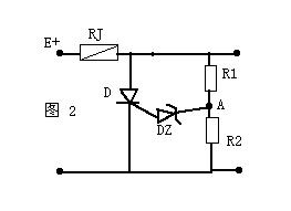 如圖2是一個電視機(jī)常用的過壓保護(hù)電路,當(dāng)E 電壓過高時A點(diǎn)電壓也變高,當(dāng)它高于穩(wěn)壓管DZ的穩(wěn)壓值時DZ道通,可控硅D受觸發(fā)而道通將E 短路,使保險絲RJ熔斷,從而起到過壓保護(hù)的作用。