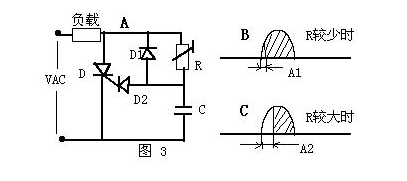 相位觸發(fā)電路實(shí)際上是交流觸發(fā)電路的一種,如圖3,這個電路的方法是利用RC回路控制觸發(fā)信號的相位。當(dāng)R值較少時,RC時間常數(shù)較少,觸發(fā)信號的相移A1較少,因此負(fù)載獲得較大的電功率;當(dāng)R值較大時,RC時間常數(shù)較大,觸發(fā)信號的相移A2較大,因此負(fù)載獲得較少的電功率。這個典型的電功率無級調(diào)整電路在日常生活中有很多電氣產(chǎn)品中都應(yīng)用它。