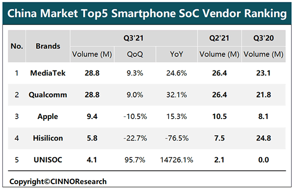 根據(jù) CINNO Research 最新報告,預(yù)測 2021 年全年中國智能機(jī) SoC 市場中聯(lián)發(fā)科為最大處理器廠商,市場占比預(yù)計增至 36%,高通預(yù)計增至 35%;中國 5G 智能機(jī)市場中高通則為最大處理器廠商,市場占比預(yù)計增至 37%,聯(lián)發(fā)科市場占比預(yù)計增至 34%。