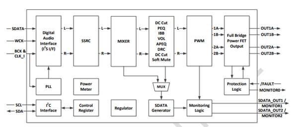 工作電源電壓范圍:5V -28V;32個(gè)可編程雙四分量濾波器,I2S輸出,2通道立體聲(20W x 2 BTL)3波段動(dòng)態(tài)范圍控制,DRC控制,音量控制。
