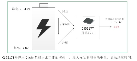 例如要得到5V電壓,必須得用升壓芯片了。但3.3V、3.6V兩種電壓,是否可以直接由鋰電池經(jīng)過降壓芯片來實(shí)現(xiàn)呢?假設(shè)要使一個(gè)典型電壓范圍為2.8V到4.2V的鋰電池提供3.3V的輸出電壓,如果使用降壓轉(zhuǎn)換器,那么電池的截止電壓必須大于3.3V,無法有效利用電池中存儲(chǔ)的電能。而降壓-升壓轉(zhuǎn)換芯片有助于充分利用電池的所有電能,因?yàn)楫?dāng)輸入電壓等于或低于3.3V時(shí),降壓-升壓轉(zhuǎn)換芯片還可以保證負(fù)載正常工作,最大程度消耗電池存儲(chǔ)的電能。如下圖所示: