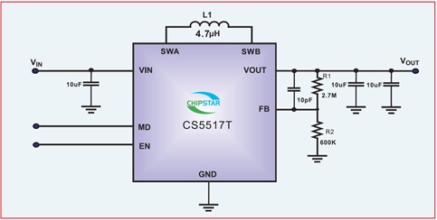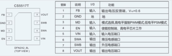 CS5517T是一款超微小型、超低功耗,高效率,升降壓一體DC-DC調(diào)整器.適用于雙節(jié),三節(jié)干電池或者單節(jié)鋰電池的應(yīng)用場(chǎng)景.可以有效的延長(zhǎng)電池的使用時(shí)間。CS5517T由電流模PWM控制環(huán)路,誤差放大器,比較器和功率開關(guān)等模塊組成。該芯片可在較寬負(fù)載范圍內(nèi)高效穩(wěn)定的工作。CS5517T的輸入電壓為1.8V至5.0V提供可調(diào)輸出電壓為(1.2V至5V)。在輸出電壓為3.3V的情況下,輸入從2.7V到4.4V,它能提供最大600mA的電流負(fù)載 . CS5517T可以通過調(diào)整兩個(gè)外加電阻來設(shè)定輸出電壓。CS5517T提供了纖小的DFN2X2_8L封裝形式 可供客戶選擇 ,其額定的工作溫度范圍為-40℃至85℃。