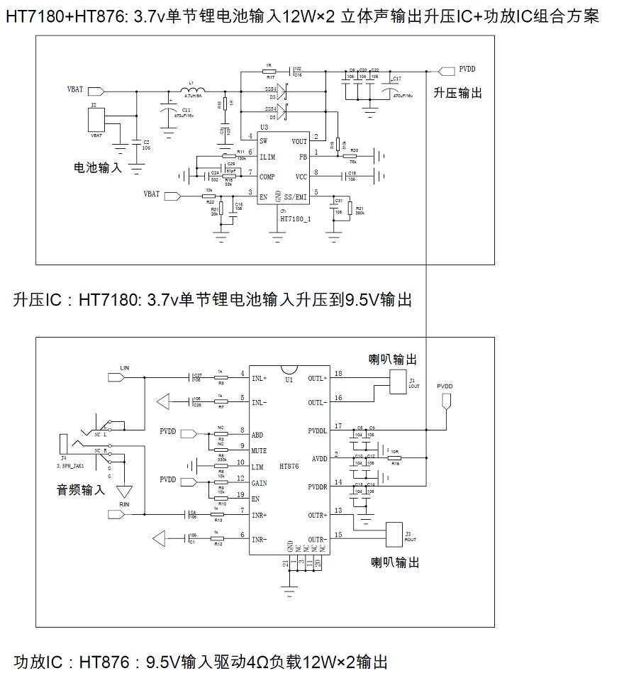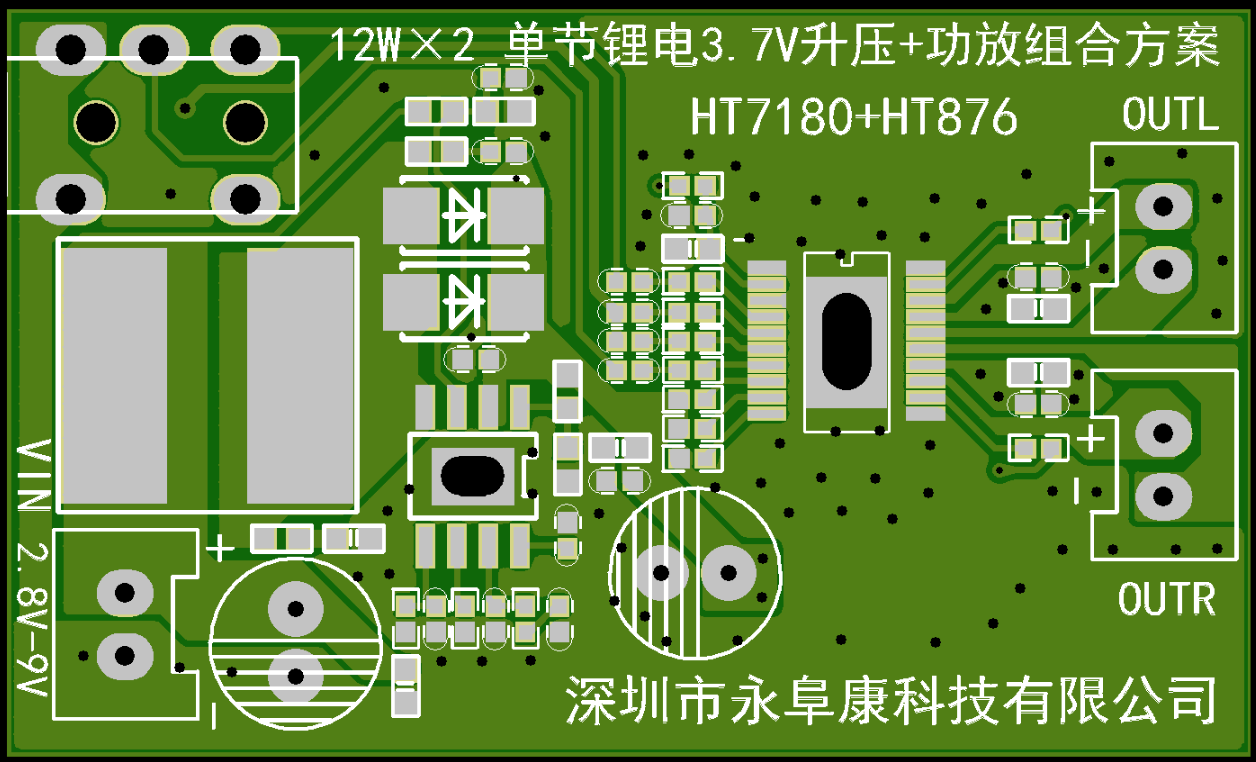 深圳市永阜康科技有限公司推出基于HT876+HT7180的單節(jié)鋰電池3.7V升壓至9.5V、2x12W立體聲升壓音頻放大組合解決方案,無需外圍MOS管、升壓效率最高達90%,外圍簡單、應(yīng)用方便。