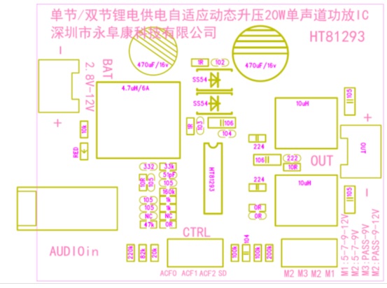 HT81293特有的自適應(yīng)動(dòng)態(tài)升壓,能根據(jù)芯片需要輸出功率的大小來(lái)對(duì)應(yīng)調(diào)整電源模塊的輸出電壓,極大提高鋰電池的續(xù)航時(shí)間;其輸入電流限制功能可設(shè)定最大輸入電流,以免因鋰電池瞬間電壓跌落太低造成主控重啟(考慮到功率要求,一般推薦最大輸入電流設(shè)定為8A左右);能通過(guò)一個(gè)主控IO口實(shí)現(xiàn)關(guān)斷、開(kāi)啟、防破音開(kāi)啟/關(guān)閉等各種模式的切換,節(jié)省藍(lán)牙主控的資源;2檔防破音模式,ACF1寬動(dòng)態(tài)音量震撼模式適合戶(hù)外拉桿音箱,ACF2高保真低失真模式適合便攜式藍(lán)牙音箱,兩種模式選擇只需要改動(dòng)外圍電阻,便可呈現(xiàn)不同風(fēng)格的音質(zhì)。