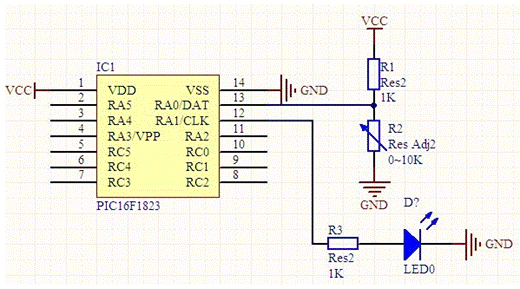 例如: 我們看第一張的原理圖,從RA0/AN0腳輸入個(gè)模擬量如果電壓大于1.2v則LED亮否則LED滅。