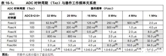我們設(shè)置單片機(jī)的時(shí)鐘頻率為32MHZ ,選擇ADC周期關(guān)鍵不要選擇陰影部分,在32MHz 這一列 我們隨意選擇了ADC時(shí)鐘周期1us,對應(yīng)的時(shí)鐘源為Fosc/32.,AD控制寄存器1 ADCON1的ADCS《2:0》=010注:ADCS《2:0》代表的意思就是 ADCS的0到2位