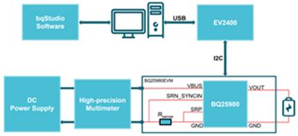 進(jìn)一步地,可以基于BQ25980的EVM板對該電流檢測方法進(jìn)行驗(yàn)證實(shí)驗(yàn)。具體的測試方案如圖3所示。
