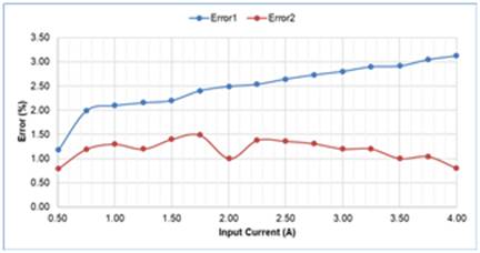 系統(tǒng)上電后,參考文檔“BQ25980EVM (BMS040) Evaluation Module User Guide”的說明將BQ25980配置為開關(guān)電容型充電模式后,逐漸調(diào)整程控電源的直流電壓,觀察記錄萬用表上測量得到的輸入電流讀數(shù);同時,使能BQ25980的ADC功能,觀察0x25h寄存器(IBUS_ADC)和0x31h寄存器(IBAT_ADC)的取值及其對應(yīng)電流值讀數(shù)的變化;實(shí)驗(yàn)重復(fù)共計(jì)三次,取平均值并整理記錄如下表所示。其中,I_IN為萬用表測得的電流讀數(shù),I_Read1為IBUS_ADC測得的電流讀數(shù),I_Read2為IBAT_ADC測得的電流讀數(shù);Error1和Error2分別為I_Read1和I_Read2偏離I_IN值的相對誤差。