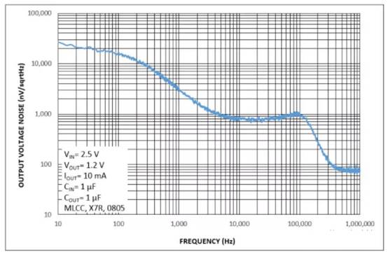 那么,我們?nèi)绾螠y(cè)量噪聲呢?如前所述,內(nèi)部噪聲是由輸入端有理想源的LDO產(chǎn)生的噪聲。在實(shí)際測(cè)量中,這個(gè)理想的源可能是電池,它比LDO穩(wěn)壓器具有更低的內(nèi)部噪聲。這種噪聲與頻率有關(guān),它由一個(gè)參數(shù)表示,如頻譜噪聲密度曲線(xiàn)或積分噪聲值(在通常為10 Hz至100 kHz的特定頻率范圍內(nèi),輸出噪聲電壓以微伏- uVRMS表示)。