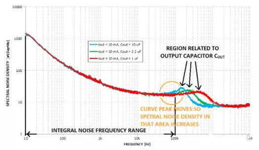 LDO輸出端的噪聲也與負(fù)載有關(guān)。負(fù)載消耗電流Iout,該電流值等于電阻 RLOAD。與負(fù)載相關(guān)的是多個(gè)RLOAD和輸出電容COUT。較高的RLOAD值或較高的 COUT值意味著與負(fù)載相關(guān)的曲線(xiàn)部分向較低頻率移動(dòng)。在上面的圖片中,您可以看到與IOUT有關(guān);在下面的圖片中,您可看到與COUT有關(guān)。