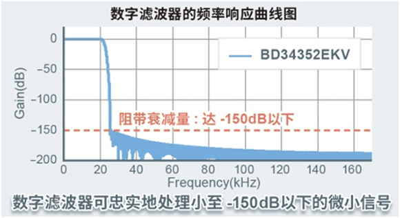 “BD34352EKV”作為DAC芯片,不僅性能參數(shù)表現(xiàn)出色(SN比:126dB,THD+N:-112dB),還提升了難以通過參數(shù)體現(xiàn)出來的音質(zhì)性能。例如,在電流段構(gòu)成的“D/A轉(zhuǎn)換電路”中,充分利用了“BD34301EKV”的電路技術(shù),重新對輸出電流量進(jìn)行了調(diào)整。此外,經(jīng)過精心設(shè)計(jì),通過“數(shù)字信號處理電路”的主要功能--數(shù)字濾波器(FIR濾波器),即使是微小的信號也可以得到忠實(shí)地處理,并且阻帶衰減量(數(shù)字濾波器的性能指標(biāo)之一)達(dá)到-150dB以下。因此,新產(chǎn)品可以充分提取音源中的信息,實(shí)現(xiàn)了讓人感受到“聲音更強(qiáng)有力、更自然而平穩(wěn)”的音質(zhì)性能。
