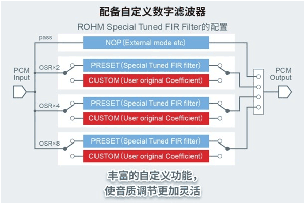 “BD34352EKV”可以對影響音質(zhì)的數(shù)字信號處理電路的數(shù)字濾波器(FIR濾波器)進(jìn)行自定義。用戶不僅可以對數(shù)字濾波器選擇“預(yù)設(shè)”、“自定義”和“外部設(shè)置”等操作,還可以通過編程功能對濾波器的計(jì)算系數(shù)和過采樣率進(jìn)行自定義。綜上所述,除了與“BD34301EKV”引腳兼容外,用戶還可以構(gòu)建自有的數(shù)字濾波器,輕松地為不同的音響設(shè)備進(jìn)行不同的音質(zhì)調(diào)整,這將非常有助于減少客戶開發(fā)工時(shí)并實(shí)現(xiàn)制造商所追求的理想音質(zhì)效果。