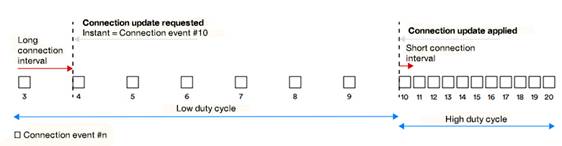 更改連接間隔會引入延遲。實際上,當設(shè)備想要更改連接間隔時,至少需要六個連接事件來協(xié)商該更改,如圖 1 所示。